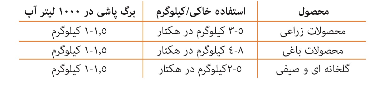 غلات (گندم، جو، برنج): مرحله ساقه‌دهی تا مرحله پر شدن دانه‌ها ( هر 10 رویک‌بار به میزان 5-3 کیلو در هکتار ـ محلول‌پاشی)
