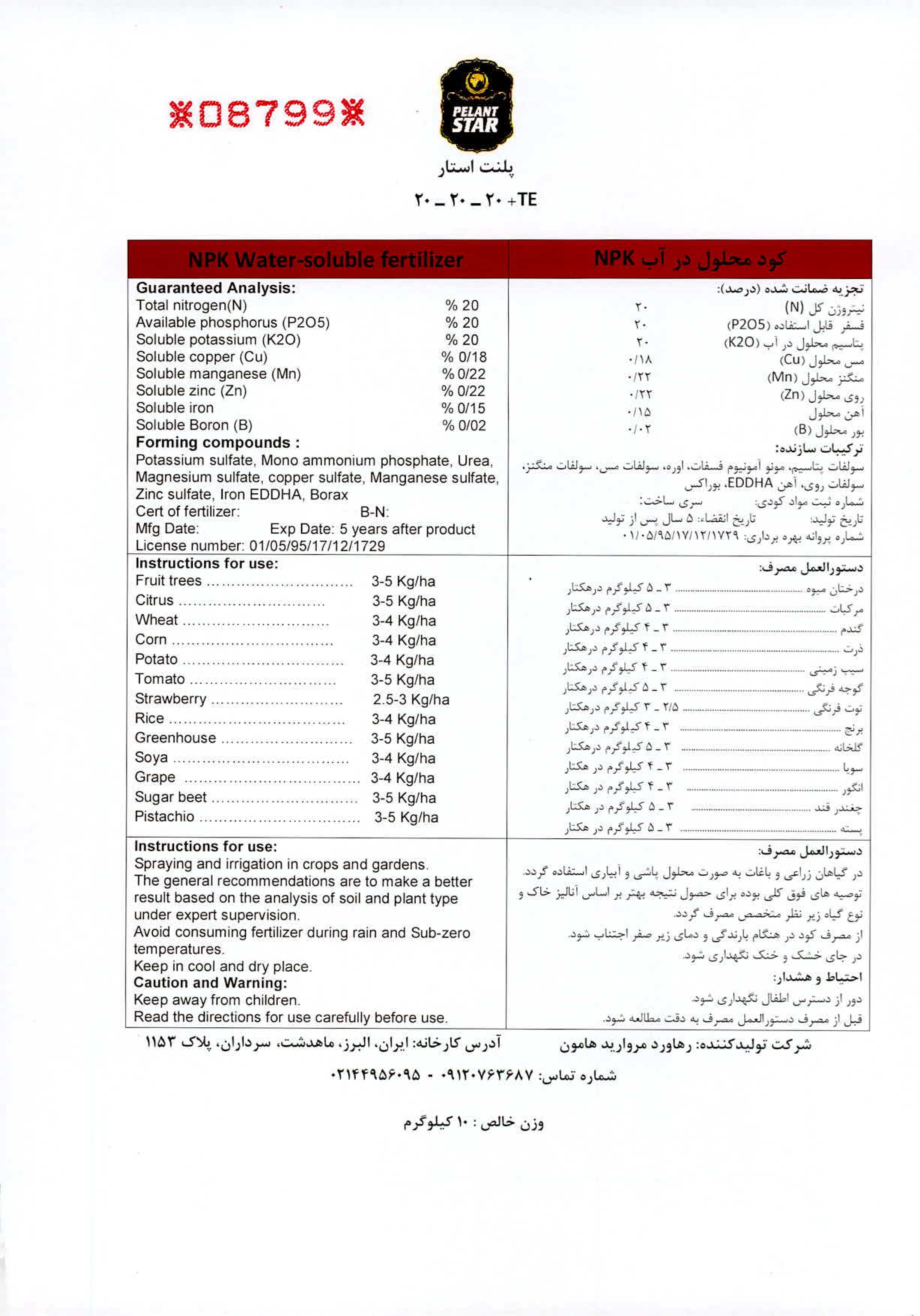کود پودری 20-20-20  عناصر اصلی نیتروژن، فسفر و پتاسیم مورد نیاز گیاه را با ترکیبی کاملاً متعادل تأمین می‌نماید.این محصول یک کود عمومی محسوب شده و به‌کارگیری آن برای همه گیاهان در تمام مراحل رشد امکان‌پذیر است. این کود عملکرد محصول و کیفیت آن‌را کاملاً بهبود می‌بخشد و به‌دلیل انحلال 100درصد، در مخازن کود به ‌هیچ ‌عنوان رسوب نمی‌نمایدعناصر ریزمغذی در این کود به دلیل کلات بودن تحت تاثیرph ، رسوب نمی‌کنند و به طور قابل ملاحظه‌ای مورد استفاده قرار می‌گیرند.